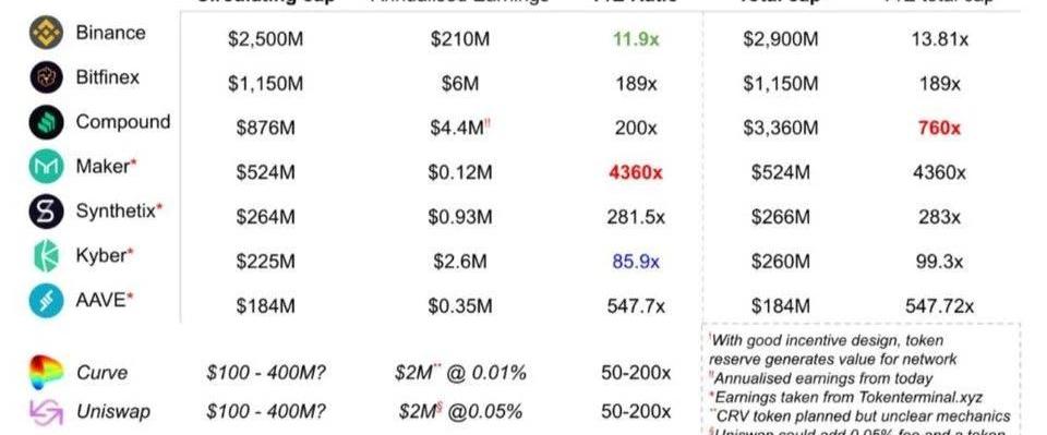 來源:JulienThevenard以上表格很好得展示了各種代幣的收益,我們可以用它來凸顯比較收益倍數進行估值可能帶來的問題。這些問題包括:收益倍數是向后看,或基于目前情況進行最大化推斷,然而不確定的未來正是估值中最重要影響因素不斷發展的代幣經濟模型可以顯著改變收益潛力,這使得在確定價值時過去和現在都無關緊要不同的價值捕獲機制,使代幣收益倍數的分母更無法比較,甚至接近于毫無意義不同的目標市場意味著不同的前景和收益潛力,從而減少了代幣之間的可比性更具體來說,上表中的許多項目在過去一年中改變了其代幣經濟模型,對上述的疑問給出了具體的實例,許多項目占據不同的目標市場,許多項目具有不同的價值累積機制,另外因為除了中心化交易所之外,項目很多,但是產生的收入卻很少,這些所謂收益倍數其實非常荒謬。這使得很難從收益倍數中得出任何參考價值,只知道所有這些項目相對于其當前收入都被嚴重高估。這不令人震驚,早在DeFi項目早期就能預料得到。這些項目將創造的絕大多數價值只能存在于遙遠的未來,這本質上是非常不確定的。但它展示了在現階段,相對估值方法可能是多么無用。