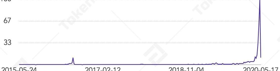來源:ByteTree,TokenInsight每50筆交易的平均手續費從每50筆交易的平均手續費來看,減半前后2000個區塊中,比特幣交易手續費從平均0.00025BTC美元漲至0.00046BTC,同比上漲84%。據TokeInsight統計,今年第一季度,礦工收入中手續費維持在1.5%比例,但在三月份次比例驟升至5.5%,并在4月份回落至較低水平。而下圖從減半前后2000個區塊的手續費占比可以看出:減半后礦工挖礦收入減少,但交易手續費收入在減半瞬間增加了200%。隨著減半后比特幣網絡的穩定運行,礦工的平均交易手續費占比從減半前的4%漲至15%左右。3.5.4礦工總收入中交易手續費占比