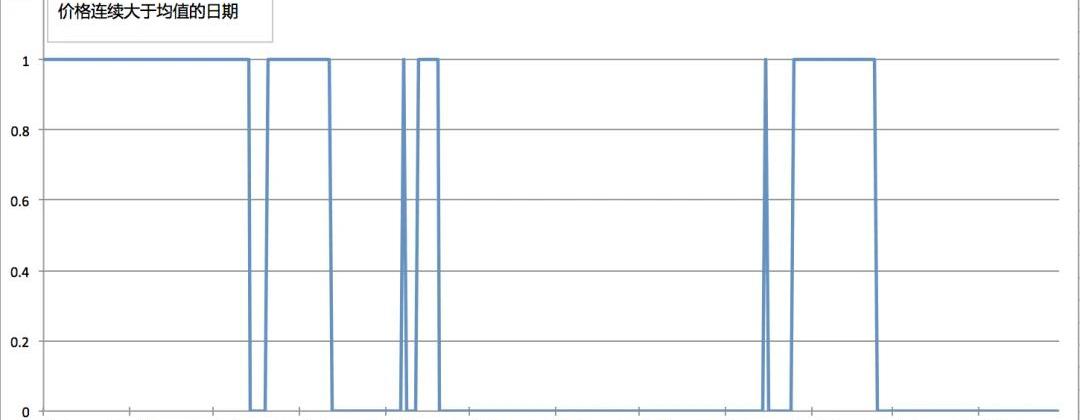 根據統計描述數據和數據直方圖我們可以看出,該分布不是正態分布。是一個正偏,低峰的分布。大多數的點分布平均并且比較散。為近一步觀察收益的正負情況,以均值3.87作為假設的買入點,觀察收益的正負的情況,圖示如下:圖表中的縱軸的1表示:EOS價格高于平均價格;0表示:EOS價格低于平均價格。橫軸為日期。