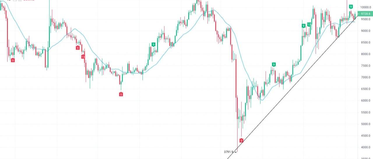 截圖來自OKExBTC/USDT現貨價格日K線圖,上周整體呈現沖高回落的走勢,期間兩度拉升,上周二再現“門圖行情”,最高價突破10000美元,隨后快速回落。周四再度走高突破9800美元,周五至周末連續回調三個交易日后,截止本周一,BTC現貨價格報9700美元附近。從下圖技術形態來看,日線級別幣價依然位于上漲趨勢線上方運行,上方10000美元繼續承壓,整體呈現三角型逐步收斂的形態,距離行情變盤給出方向越來越近。指標來看,MA20繼續呈水平,短期TD指標出現綠色序列9,多空在該位展開博弈。