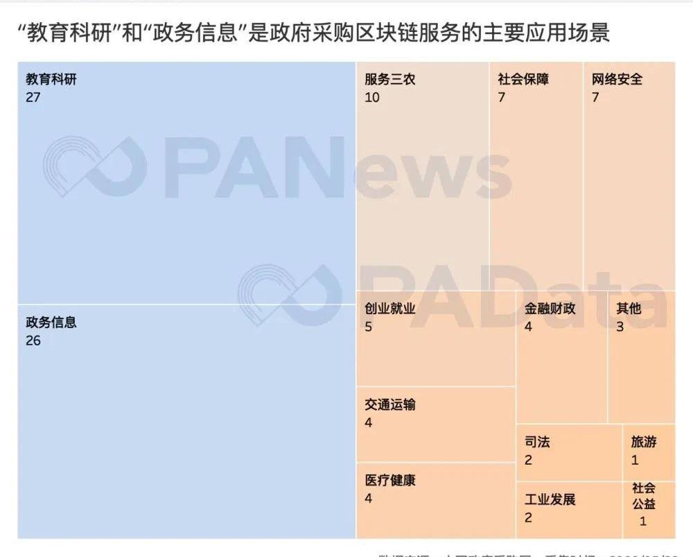 而且從各省去年和今年的省內中標率變化來看,區塊鏈政府采購的省內中標率還在提高。比如廣東省、廣西省、山東省和云南省4省的省內中標率都從2019年不到70%上升至2020年100%。另外值得注意的是河北省、黑龍江省和福建省,3省的省內中標率都很低,河北和黑龍江所有的政府采購案均由外省公司承接,黑龍江省僅12.5%的采購案由省內公司承接。這三省的政府單位雖然有意發展區塊鏈產業,但省內區塊鏈基礎或較為薄弱。旅游和社會公益是新場景,教育科研和政務信息是主要應用場景