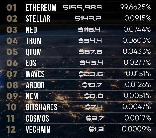 除了DAPP數量上被以太坊生態全面超越,EOS和波場都因“DAPP”泛濫招至批評,甚至有安全機構PeckShield曾發現,在EOS近50萬用戶中,有近12萬個賬號為群控賬號,占比39%,真正的活躍用戶只占37%。去年11月1日,EOS公鏈上舉辦了一場零成本薅羊毛空頭活動,在交易前兩天曾達到峰值每小時62萬,這直接導致EOS網絡崩潰。其曾所稱的百萬TPS,顯得諷刺而饒有意味。除了DAPP,在代幣數量和市值方面,EOS對以太坊的挑戰依然稱不上成功。加密貨幣分析師Moocharoo統計了Coinmarketcap上市值排名前2000的代幣數據,發現其中1113個代幣基于以太坊發行,其市值占到了統計總市值的99.66%,相比之下,無論是NEO還是EOS都差強人意。1、以太坊:1113個幣種;2、小蟻NEO:21個幣種;3、Stellar:18個幣種;4、EOS:14個幣種;5、Waves:13個幣種;6、比特股:10個幣種;7、波場:9個幣種;8、量子鏈:7個幣種;9、唯鏈:3個幣種;10、Cosmos:2個幣種。