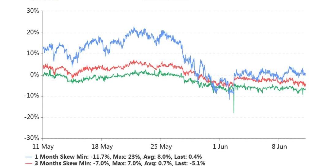 持倉量11億美元,持倉量繼續處于新高位置。交易量平穩。各標準化期限隱含波動率:今日:1m66%,3m70%,6m74%6/10:1m65%,3m69%,6m74%隨著昨夜的大幅度打針,隱含波動率略有上漲。