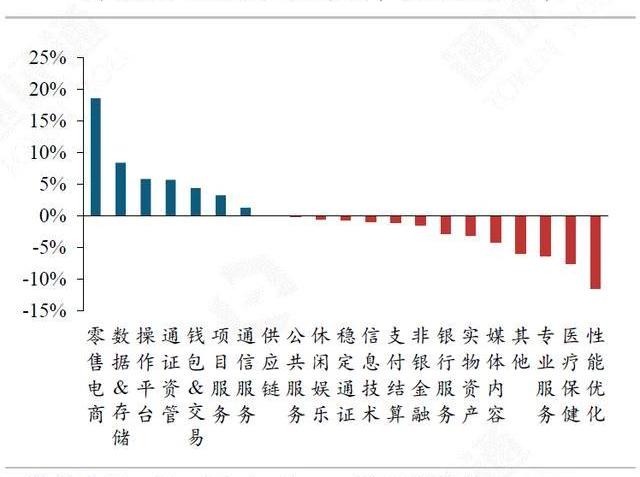 2.3BICS行業:零售電商市值增長明顯在市值排名前五位的BICS二級行業中,支付結算行業市值從70.9%降至70.1%,從市值占比變化率看,零售電商行業市值占比增速較高。