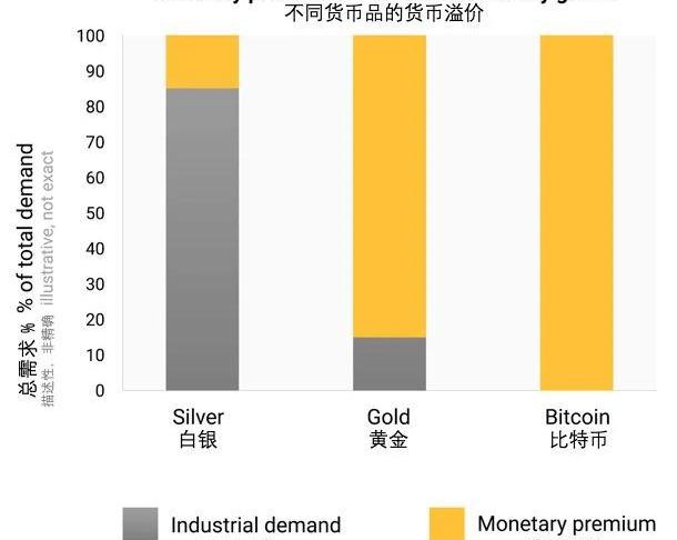 在貨幣化的過程中,貨幣品的購買力將會飆升。許多人評論說,比特幣購買力的增加造成了“泡沫”的出現。雖然這個術語通常貶低地表明比特幣被嚴重高估,但它無疑是恰當的。所有貨幣品共有的一個特征是,他們的購買力高于僅憑其使用價值所證明的購買力。實際上,歷史上許多貨幣都沒有任何使用價值。貨幣品的購買力與其固有用途所指示的交換價值之間的差異可以被認為是“貨幣溢價”。隨著貨幣品在貨幣化階段的轉變,貨幣溢價將會增加。然而,溢價不是一條筆直的、可預測的線。正在貨幣化過程中的一種物品X可能會被另一種更適合作為貨幣的物品Y所擊敗,而X的貨幣溢價可能會下降或完全消失。白銀的貨幣溢價在19世紀后期幾乎完全消失,當時世界各國政府基本上放棄了它作為貨幣而轉向黃金。