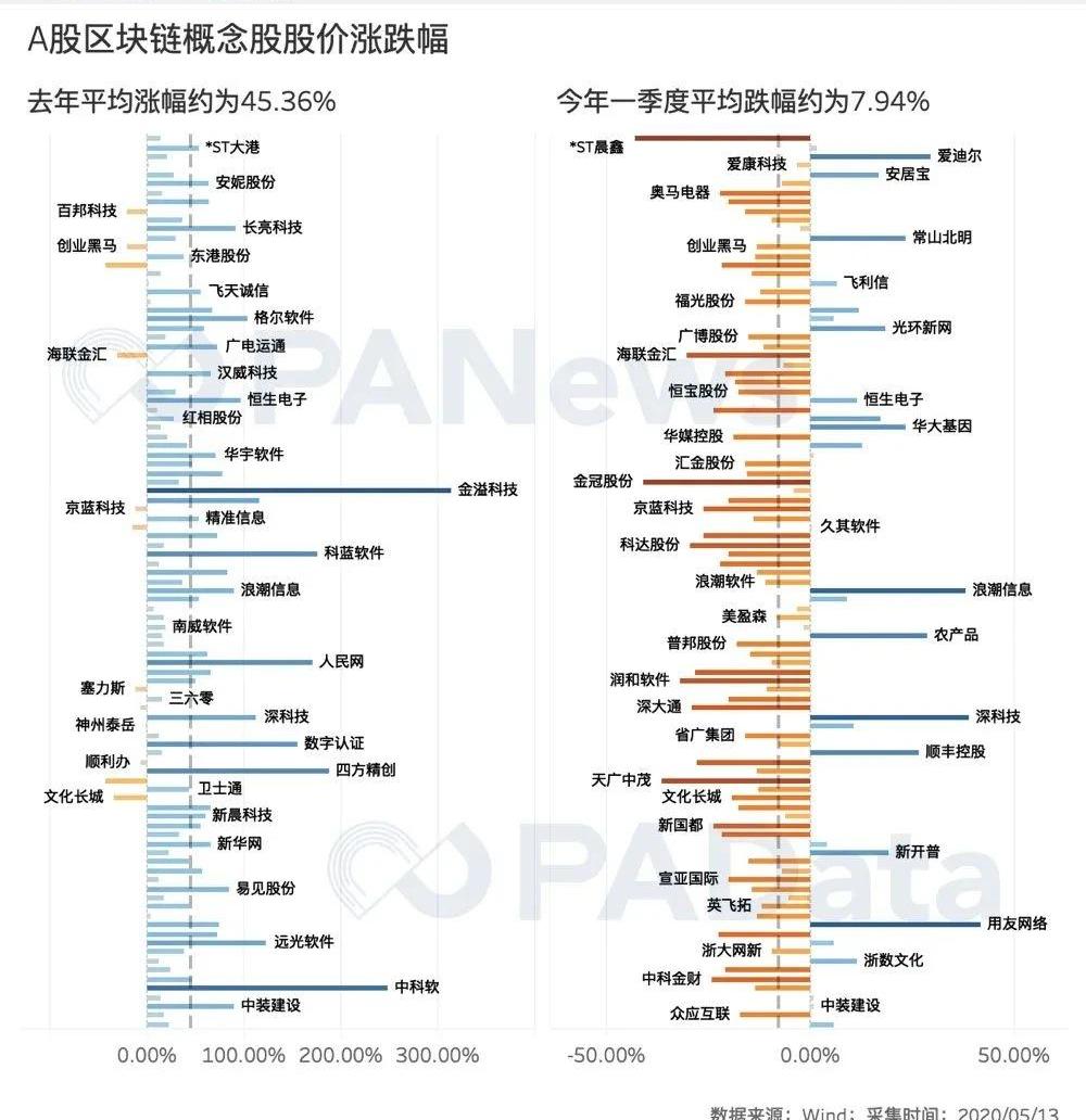 按照去年平均1.4億元凈利潤折算,去年平均每季度凈利潤約為0.35億元,而根據今年一季報的數據,或受到疫情影響,今年一季度99家A股區塊鏈概念公司的平均凈利潤僅為0.11億元,遠低于去年平均季度表現。99家A股區塊鏈概念公司中有47家公司一季度實現盈利,其中,順豐控股是今年一季度凈利潤最高的區塊鏈概念公司,約為8.32億元,其次是新湖中寶和三六零,凈利潤分別達到了4.12億元和3.39億元,還有7家公司一季度凈利潤超過1億元。另外52家公司一季度虧損,其中,用友網絡虧損最多,高達2.51億元,常山北明、藍盾股份、衛士通和天廣中茂一季度虧損也都超過1億元。與此同時,區塊鏈概念股的凈利潤表現一年不如一年。根據統計,A股區塊鏈概念股2019年凈利潤同比平均下跌96%,2020年一季度凈利潤同比下跌123%。