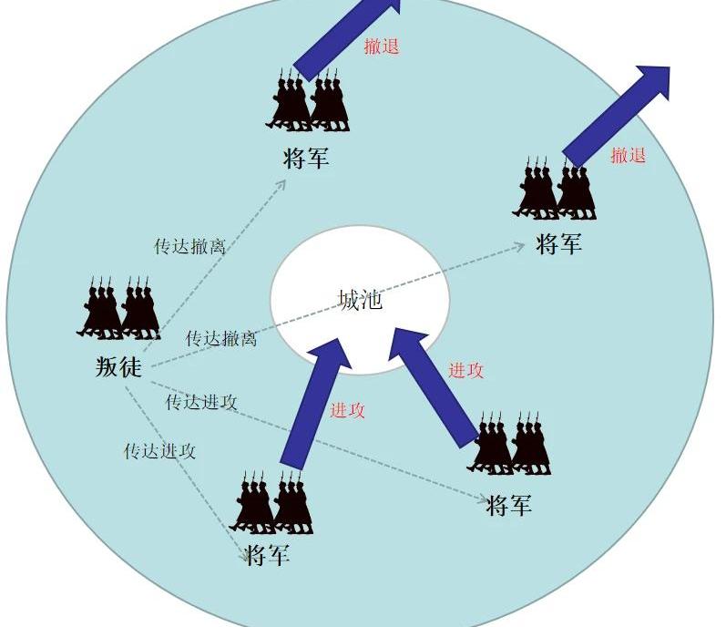 分布式,意味著記賬行為由多方競爭,任何人都能競爭,如果各方記賬不同,彼此不一致,以誰的記錄為準?1982年,圖靈獎得主萊斯利?蘭伯特在一篇論文中將分布式系統的一致性問題形象地比喻為“拜占庭將軍問題”:拜占庭帝國派出10支軍隊分散在敵城四周圍而攻之,已知6支及以上的軍隊同時進攻才能攻下敵城。10支軍隊間依靠通信兵進行通信,以統一進攻時間。各軍隊由各自將軍指揮,但可能有將軍是叛徒,叛徒會將接收到的進攻時間篡改后再發出,或不按商定的時間進攻,因此,拜占庭將軍題便是如何才能保證有6支及以上的軍隊能夠同時發起進攻。