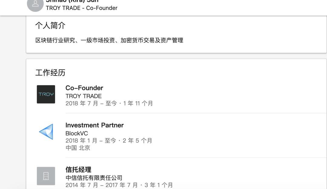Troy的投資人們,無一不說“這就是BlockVC自己的項目”。對于BlockVC和Troy的關系,共識實驗室創始人王峰認定Troy就是BlockVC換皮包裝的項目,然而今天TROY成員公開發聲撇清自己和BlockVC之間的關系,稱兩者是兩個獨立運營的機構。深潮TechFlow發現,Troy的聯合創始人兼CEO孫詩皓同時也是BlockVC合伙人,并擔任BlockVC二級市場獨立品牌BlockTop的投資總監。孫詩皓的linkedin信息顯示,其同時任職于Troy以及BlockVC。