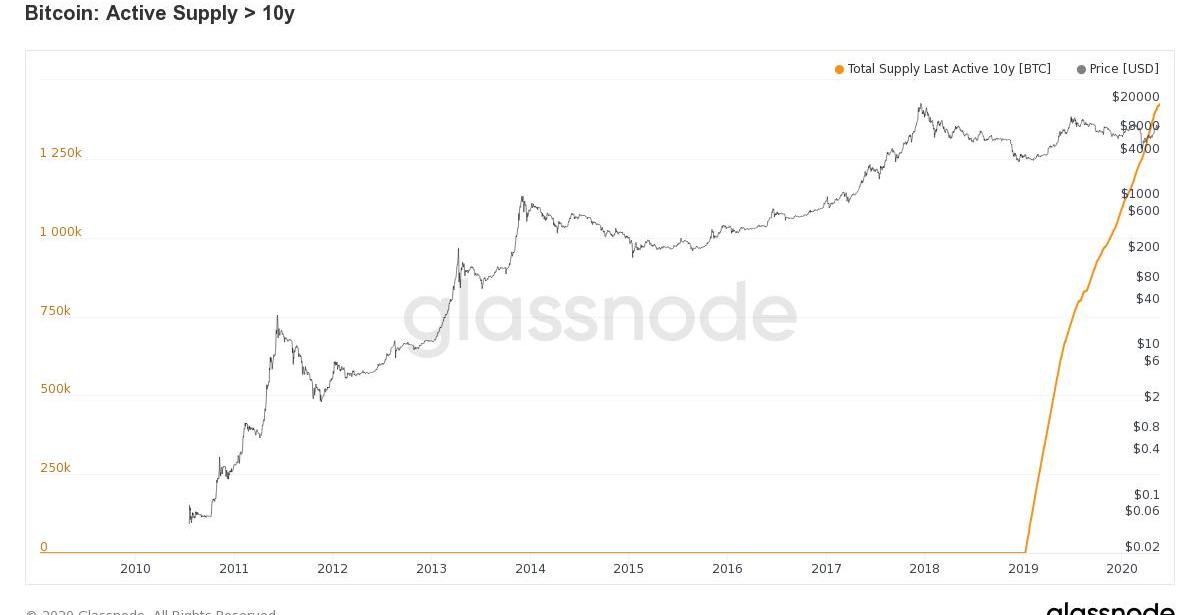 比特幣價格下跌。資料來源:TradingView昨晚這筆交易的比特幣可以追溯到很早期的階段,但這些“古老的”比特幣并不是唯一在錢包里沉寂的,仍有140萬個比特幣在10年內都沒有活躍。