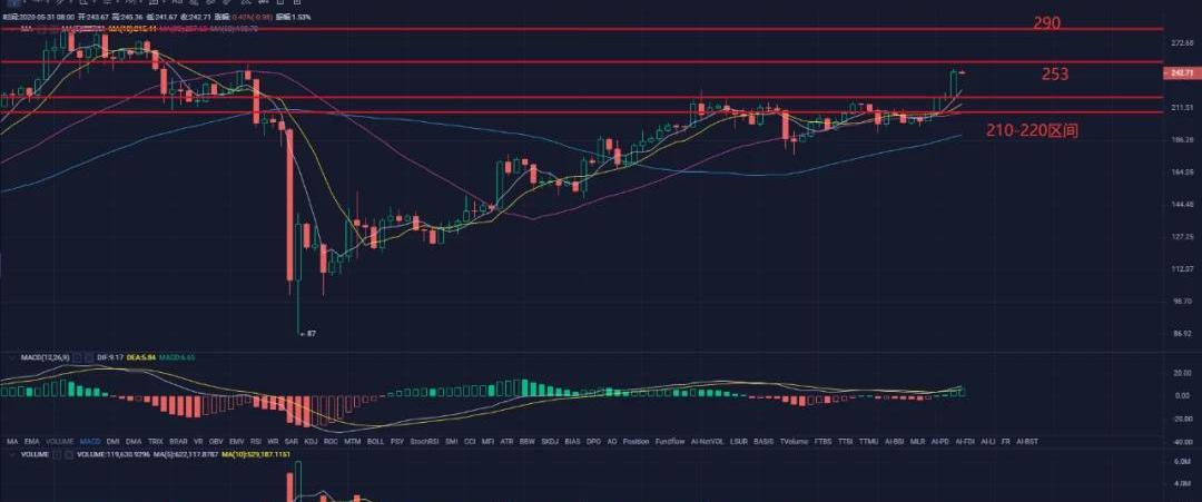 從上午的回踩情況來看,節奏還是比較不錯的,至少回踩途中量能是在縮量的,說明目前沒有空頭參與其中,若是突然放量的話極有可能是回踩后抄底的籌碼介入,輕倉然后設好止損便是。再看看以太坊,可以看出,ETH是唯一一個強勢突破前高的幣種,我們將其上漲后的情況分為三個階段,一個是下方210-220的支撐區間,這也是前期比特幣高位跌下來第一次震蕩的位置,第二個是253美元,是前期高位回落時震蕩整理的高位,也是目前的下一個壓力位。第三個便是前高290美元。