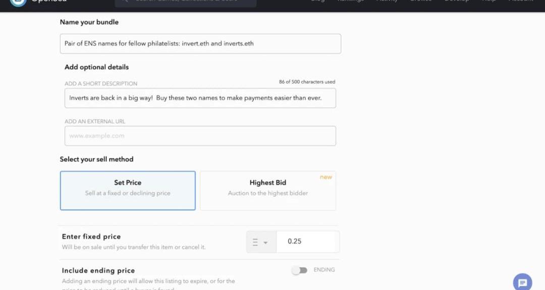 將鼠標放在導航菜單的“Account”選項上,然后在下拉菜單中選擇“SellaBundle”。在打包頁面,我從我所擁有的域名中選擇了invert.eth和inverts.eth。