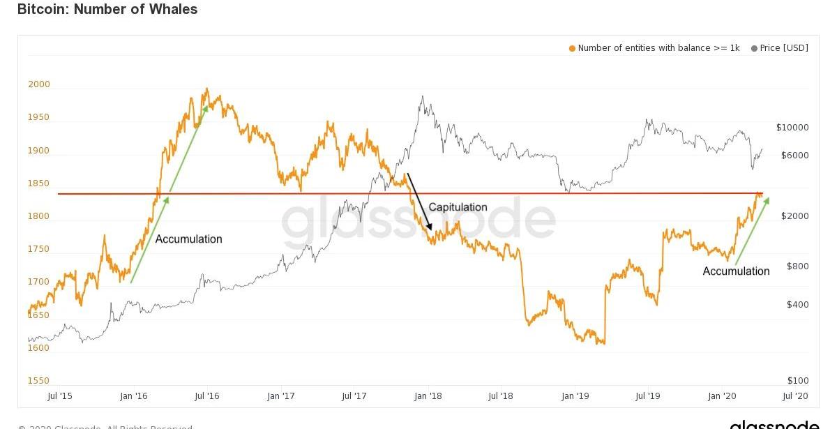 這些網絡活動增加很可能是由于近段時間比特幣交易量的增加,3月暴跌之后,比特幣網絡每天的確認交易數量在低位徘徊了一段時間,最近開始回升。當然,和最近半個月的幣價有所升溫也有關系,很多人可能依然對即將到來的減半事件抱有期待,也是他們購買比特幣的動力之一。第二個訊息,目前比特幣“巨鯨”數量達到了兩年內新高。如下圖,目前持有至少1000個比特幣的地址數量現在略低于1850個,這個數量和2016年年初幾乎完全相同。Glassnode表示:“這一趨勢意味著,盡管市場環境不確定,但巨鯨仍然相信現在是囤積比特幣的好時機,這表明他們認為還有進一步增長的空間。”分析師KeithWareing認為大礦工可能會逢低買入,在5月中旬比特幣減半之前囤積更多的比特幣鞏固地位。