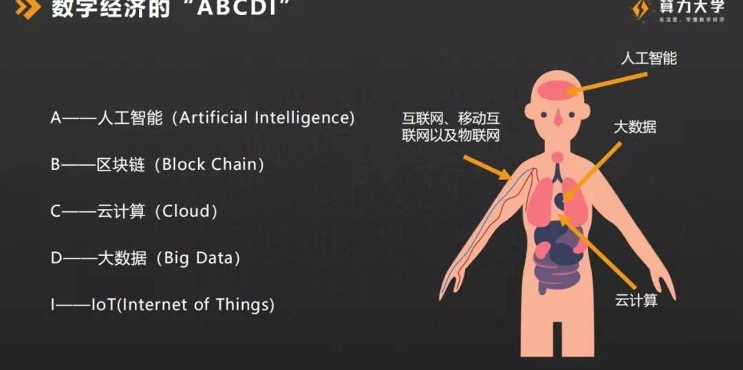 “ABCDI”協同下的產業數字化與數字產業化今天我的主題叫數字經濟的ABCDI,也就是人工智能、區塊鏈、云計算、大數據、物聯網,這是我認為目前數字經濟中最重要的5個模塊。我把原來的E,邊緣計算替換成了I,物聯網。