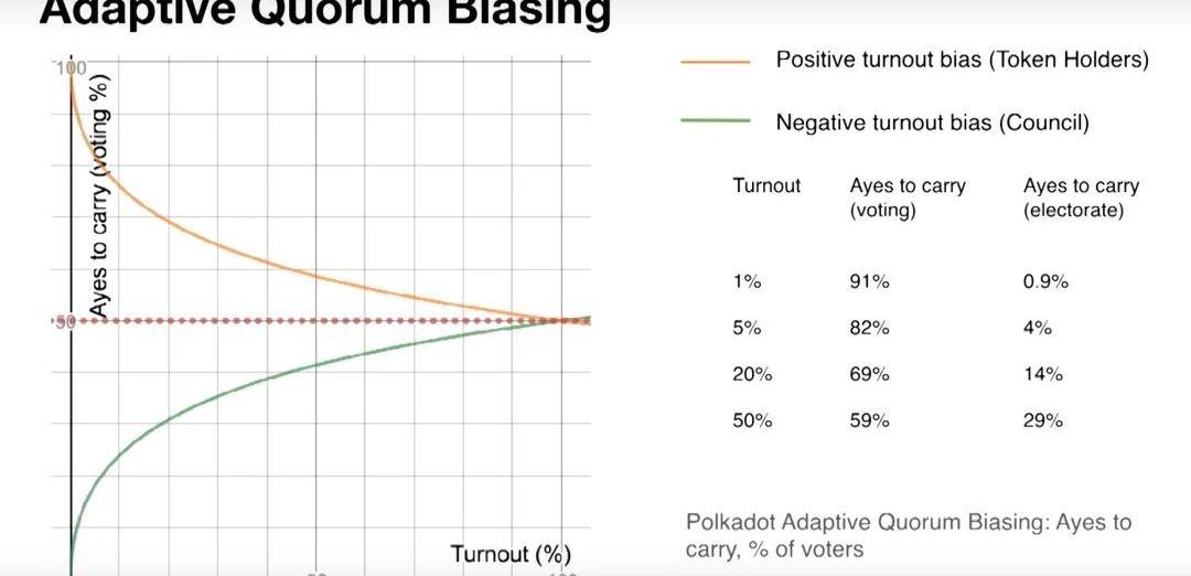 *圖片來源自網絡自適應法定人數偏差通過基于投票率的投票多數要求,在低投票率情況下提供靈活性,使得如果沒有明確多數投票權支持或反對的提案更容易或更難通過。舉例而言,一個礦工可能愿意承擔更多風險,并在投票支持公投改變他們的底線時自愿鎖定DOT最長時間。如果Referenda通過,則礦工的DOT將被鎖定,他們將面臨一定的經濟損失風險。如果Referenda沒有通過,礦工的代幣就不會被鎖定,如果他們覺得不能接受,他們可以出售或退出系統。