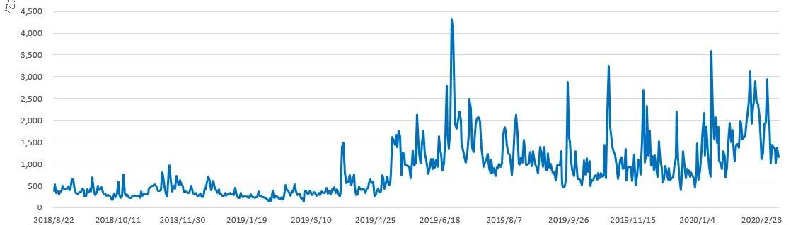 資料來源:非小號,TokenMania從更長的時間維度來看,19年初九大交易所日交易量基本處于400億元上下區間震蕩,二季度市場在一波上漲中成交量連創新高,九大交易所日交易量一度突破4300億元高點;7月以來市場成交量呈現持續震蕩縮量態勢,日均交易量均值降低到1000億元以下;10月底比特幣快速拉升一度突破10000美元上方,日成交量突破3000億元創下高位,而后市場成交量再次呈持續回落態勢。2020年初減產預期疊加地緣沖突與疫情所致避險情緒等因素作用下,量能同步放大,近一個月日成交量最高接近3600億元;本周市場誘多沖高回調,主流交易所成交量較上周縮量明顯,單日成交量最高僅1436億元。考慮到目前各大交易所存在刷量的行為,實際成交數據可能低于統計數據。全球比特幣場外交易量減少5.45%至3225.4萬美元,中國比特幣場外交易量減少7.39%至645.4萬元,委內瑞拉比特幣場外交易量增加27.19%至3076.8億玻利瓦爾,依據當前委內瑞拉玻利瓦爾和人民幣兌換比例計算,最近一周場外BTC交易量約2923.868萬元;前一個統計周按當時匯率計算的場外BTC交易量約2276.268萬元,最近一周較前一周增加28.45%。圖5LocalBitcoins全球交易量