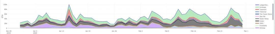 接下來,我們來看一下主要DEX交易量變化情況,通過記錄1、2月份DEX交易量的數據,我們發現,Uniswap依舊穩居榜首,在2月23日出現了一個谷底,2月27日,Tokenlon、LedgerDex、IDEX、Kyber等聯動Uniswap,達到2月交易量的峰值。