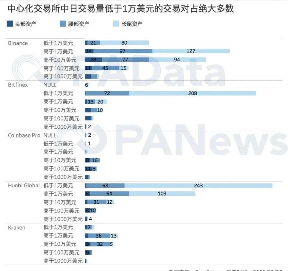 中心化交易所中有多少長尾資產?這些長尾資產的交易量如何?PAData統計了Binance、Bitfinex、Coinbase、Huobi和Kraken這五家交易量較高的交易所當前的宏觀資產流動性現狀。從流通的幣種數量和交易對數量來看,Binance和Huobi的資產流通廣度更大。Binance上架了194種代幣,開通了637對交易對,Huobi上架了227種代幣,開通了558對交易對。而Coinbase和Kraken上架的資產數量則要少很多,兩家交易所分別上架了25種資產和32種資產,開通了58對交易對和131個交易對。