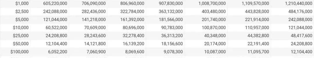 -根據不同的以太幣價格和質押率,要達到阿根廷M1供應量的51%需鎖定的以太幣數量-上述論述僅針對阿根廷而言雖然135.8億的Dai流通量看似驚人,但是對于未來或將建立的全球免許可型經濟體系來說,這只是很小的一部分,畢竟傳統資本市場的總價值就高達數百萬億美元。我們再進一步推理下去,假設Dai開始與美元競爭,成為一種全球貿易貨幣形式。已知美元的M1貨幣供應量達到了40340億,假設Dai在其中占到了10%,則其流通量達到了4034億。假設質押率為250%左右,需要多少以太幣經濟帶寬才能鑄造出這么多Dai呢?即使是按以太幣的歷史最高價格1400美元來算,需鎖定663.1%的總流動供應量才能為4030億的Dai流通量提供足夠的帶寬。我們需要更多經濟帶寬。假設MakerDAO中鎖定了總流動供應量的46.42%,比2016年TheDAO巔峰期高出3.5倍,以太幣的價格必須達到2萬美元才能為數千億Dai流通量提供足夠的經濟帶寬。如果僅鎖定18.57%的以太幣流動供應量,以太幣的價格就要達到5萬美元。最后,如果按照目前消耗率范圍來鎖定以太幣的話,大約要鎖定大約3.7%的總帶寬,以太幣的價格必須超過25萬美元,也就是說,總的免信任型經濟帶寬要達到27萬億美元。按照今天的160.2億美元市值,還要漲1665倍才夠。