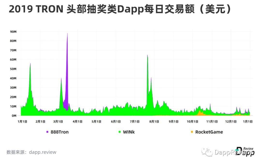 用“區塊鏈上的拉斯維加斯”來形容2019年的波場Dapp生態是最合適不過的,交易額前十的波場Dapp中有8個是抽獎類Dapp。2019年,波場Dapp總交易額為44億美元,其中抽獎類Dapp貢獻了39.9億美元。無論從流水、玩法還是游戲體驗上,波場上的抽獎類Dapp都已對其他鏈形成了碾壓之勢。