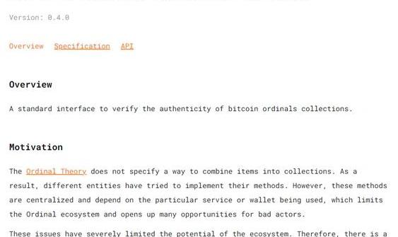 此外,BRC-721:OrdinalsCollectionProtocol也頗具吸引力,它是一個驗證比特幣序數集合真實性的標準接口。對于目前的Ordinal協議來說,問題的根源在于,序數理論并未明確規定如何將項目組成集合,導致人們采用了各種不同的處理方式。然而,這些方法往往是中心化的,并依賴于所使用的特定服務或錢包。這種情況限制了Ordinal生態系統的發展潛力。因此,有必要找到一種去中心化且無需信任的集合創建和驗證方法。BRC-721協議引入了一種去中心化和無信任的方法來創建集合并驗證,這種方法類似于以太坊區塊鏈上的ERC-721標準。通過提供單一的真實來源,可以簡化集合創建和驗證過程,而且不需要預付費用。
