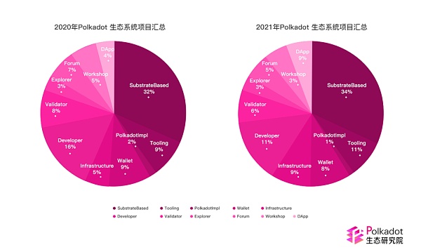 對比兩年的數據,我們可以看出SubstrateBased和基礎設施項目和DApp賽道的生態項目有明顯的增加,而基礎設施項目和DApp在所有生態項目中的占比均有所增加。