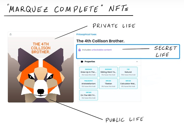 也有一些NFT頭像在鑄造之初就已經具備了一些較為鮮明的特點,比如前文提到的加密女巫Crypto Coven系列NFT,天然與性別議題相關;還有Philosophical Foxes系列,每只小狐貍都有獨一無二的形象,獨一無二的個性、哲學思考,甚至秘密。這些也許能夠帶來敘事的火花,幫助我們把靜態的圖像變成一個個故事,并隨著時間的推移而獲得更大的敘事權重。