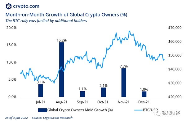 從下圖可以看出,自2021年下半年開始特別是8月加密用戶增長率增長非常強勁,高達15.2%,這有助于比特幣價格隨后的出色表現。