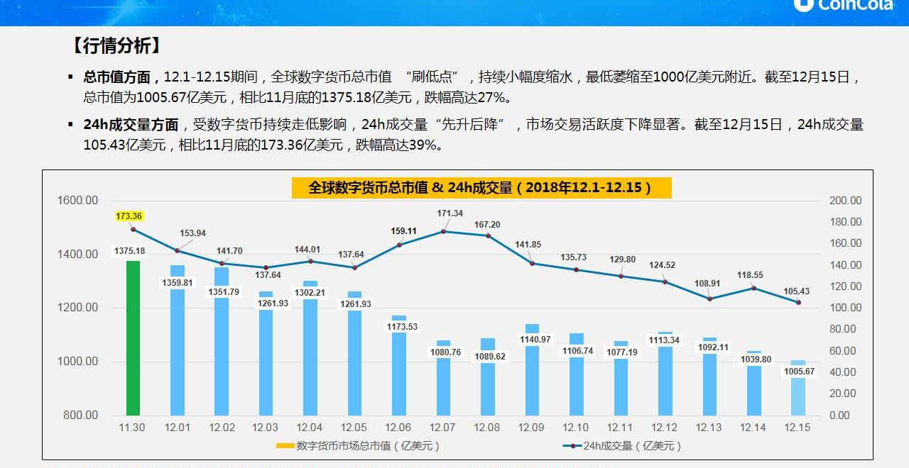 XRP/HKD-1.7%12.01-12.15期間,全球數字貨幣市場逐步小幅度萎縮,市值在1000-1400億美元之間波動。本文重點關注“ETH君士堡分叉升級即將進行…”與“USDT在穩定幣流通總額占比降至72.2%”兩個熱點事件,并優先摘取報告要點進行推送。1行業概覽1.1市場總體行情