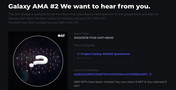 除了相對復雜的NFT活動外,Galaxy也提供輕量級的徽章NFT,功能非常像POAP,用戶參加活動即可獲得一個徽章證明,鏈路更簡單。如下圖所示,參加Galaxy的AMA活動,填寫提問表,就可以獲得一個活動徽章。