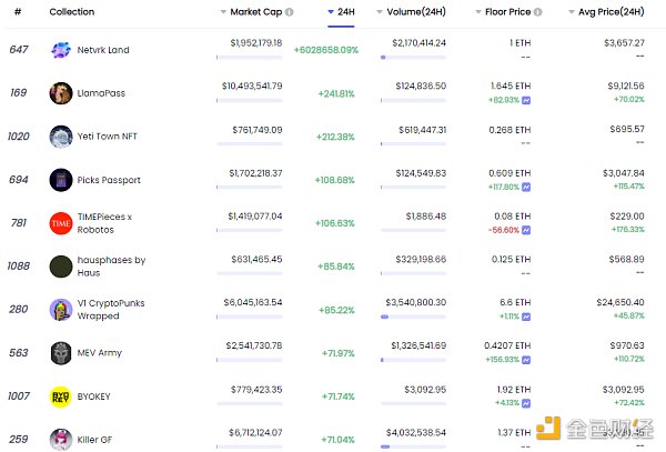 24小時內銷售漲幅前十的NFT 數據來源:NFTGO