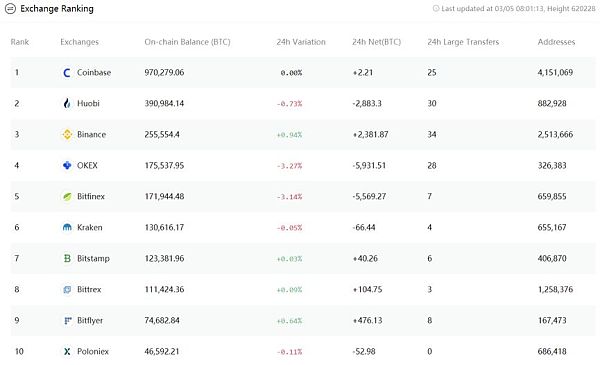 本周,鏈上BTC余額前三名之后的交易所排名交替較為頻繁。在補上了OKEx的一些錢包地址之后,OKEx目前鏈上余額排在第四。除此之外,本周OKEx有超過兩萬BTC流入,幣安有近7000BTC流入。
