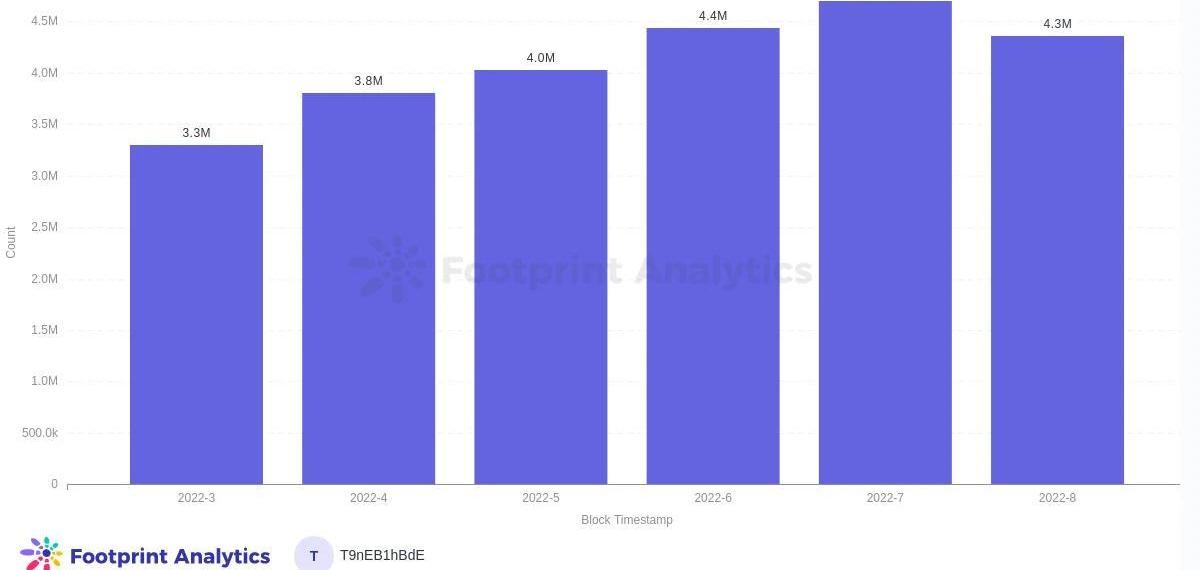 8月份的總交易量環比下降了6.2%。另一方面,NFT交易次數沒有明顯下降,在連續5個月可觀的漲幅之后,僅出現8.5%的小幅回落。這可能表明,盡管市場價格下跌,但NFT技術正在獲得更廣泛的采用。
