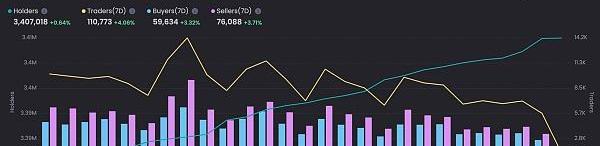 本周NFT市場的持有者/交易者活躍度小幅度提升,買家相比上周增長3.32%,賣家同比上升了3.71%,驗證了堅定的持有者的保守態度,不做大批量交易的想法。