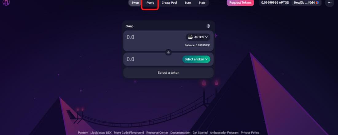 訪問https://liquidswap.com/并連接錢包。此應用程序將使用Pontem錢包。
