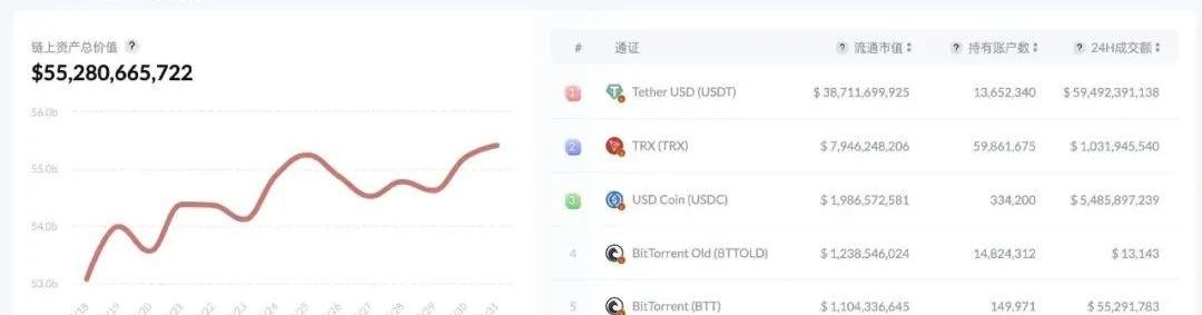 XRP/HKD+0.79%6月1日,據區塊鏈瀏覽器TRONSCAN數據,波場鏈上資產總價值為55,280,665,722美元,突破550億美元。