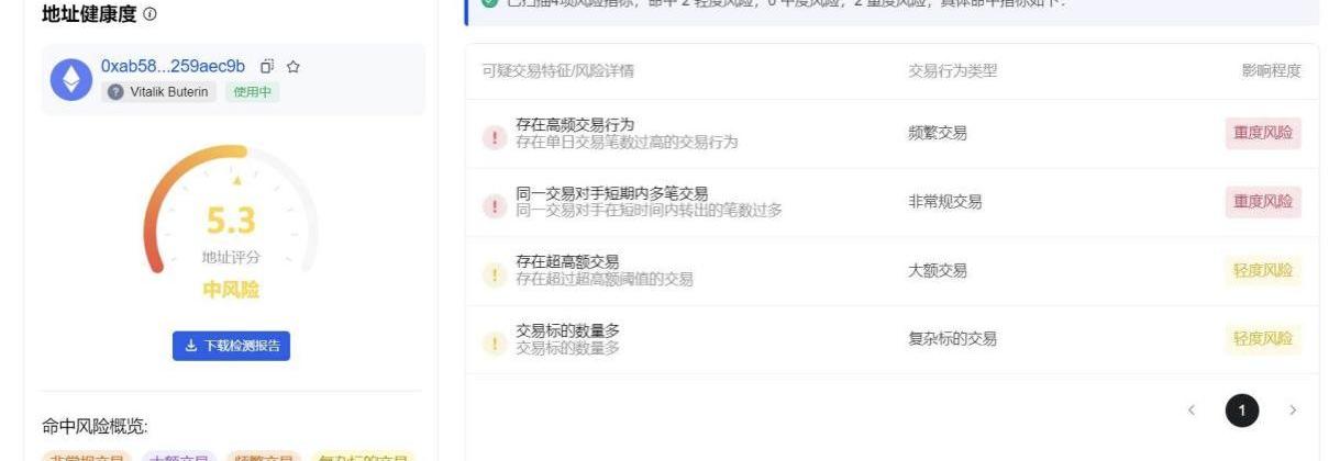 以上圖為例,就是VitalikButerin某一地址的地址健康度,經過判斷他的地址分值為5.3分,中風險,命中風險主要是頻繁交易、非常規交易、大額交易和復雜標的交易。