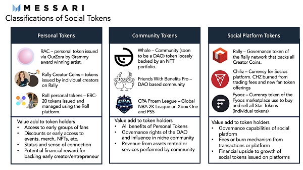 知名研究機構Messari一份報告將社交代幣分為三類:個人代幣、社區代幣、社交平臺代幣。這也是目前最主流的社交代幣分類:?