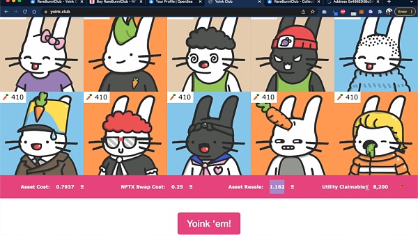 而 Yoink Club 帶來的解決辦法是,先在二級市場 OpenSea 上以地板價購買 NFT,再從購買的 NFT 中提取出這種效用屬性,然后去 NFT 流動性協議 NFTX 進行 NFT 兌換(NFTX 允許用戶將其 NFT 兌換成該 NFT 機槍池中的其他任意一個 NFT),還可以再從新兌換的 NFT 中提取出效用屬性,共獲得雙重效用屬性。