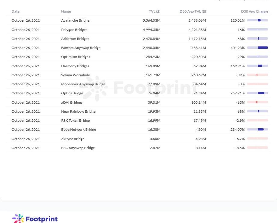 據Footprint的數據顯示,截止至2021年10月26日,跨鏈橋的TVL為162億美元,近30天增幅72.25%之上,發展速度迅速。其中占比最大的4個跨鏈橋分別為AvalancheBridge、PolygonBridges、ArbitrumBridges以及FantomAnyswapBridge,已占據整個跨鏈橋的95.61%,月增幅最高FantomAnyswapBridge的達到了401.23%。