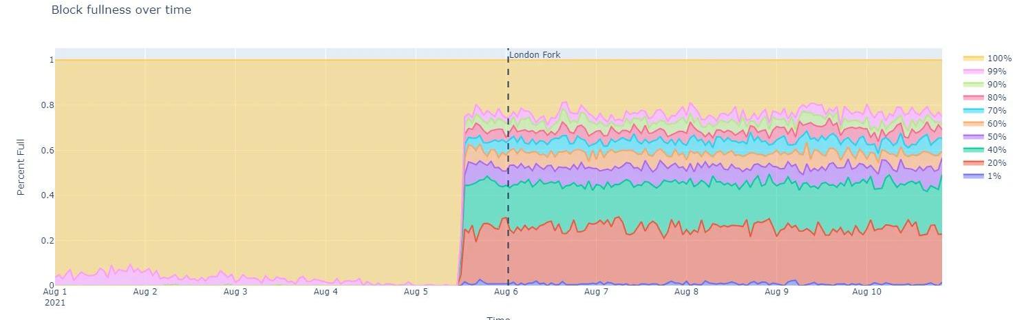 根據圖9所展示,可以看出結果是相當明顯和驚人的。在倫敦硬分叉之前,幾乎每個區塊都在99%至100%之間,對于那些不怎么滿的區塊,幾乎總是至少有90%是滿的。