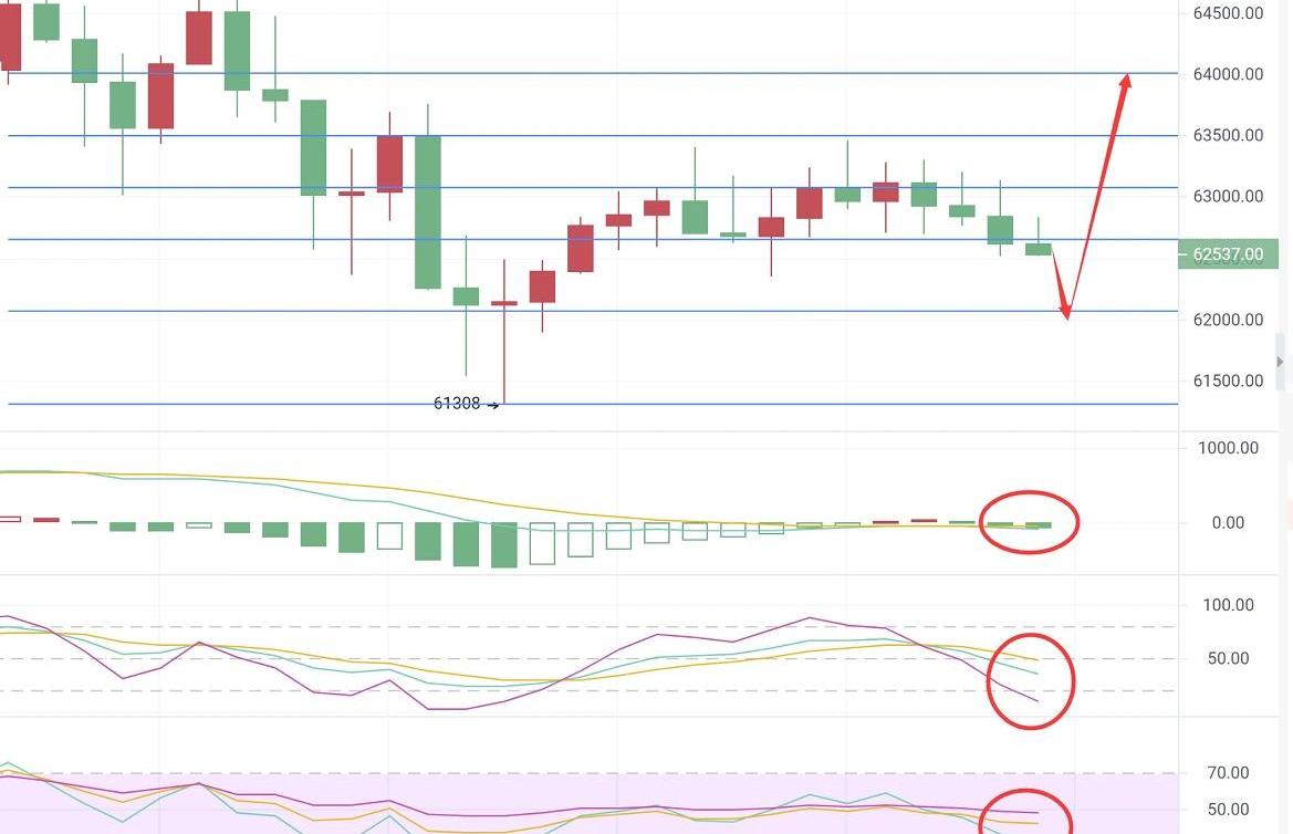 回踩62000-62500分批接多,目標看63000-63500,破位看64500,防守61500