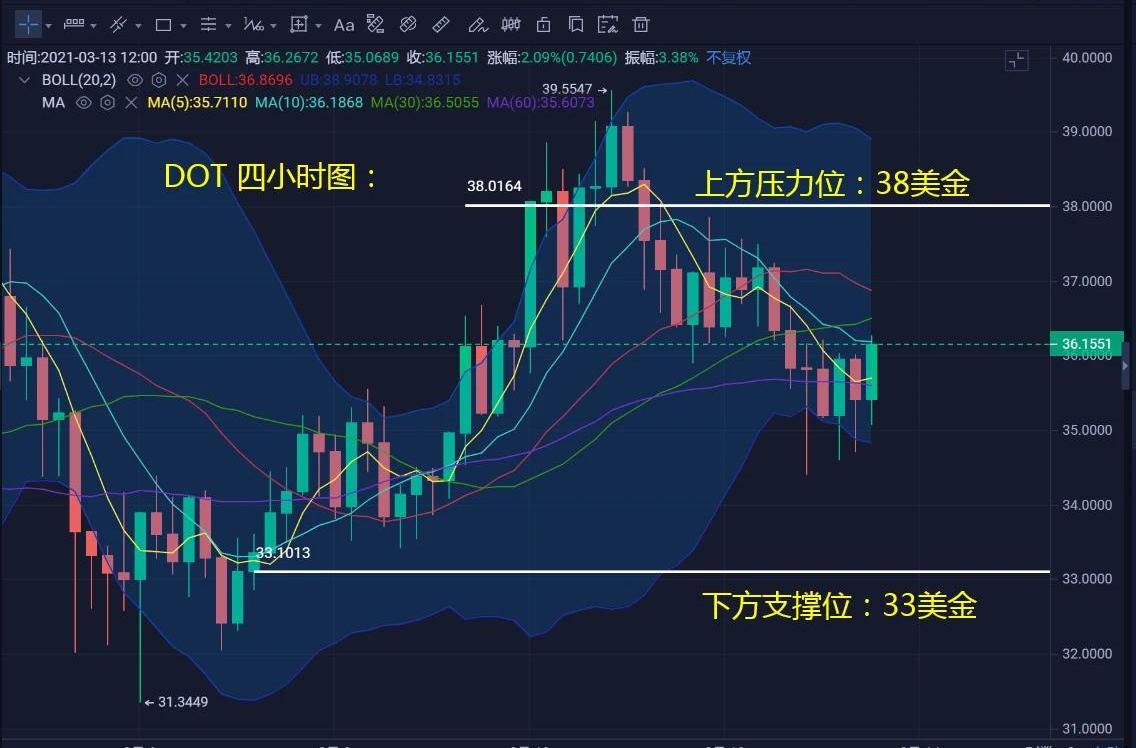 DOT,4H級別昨天在大盤的帶動下跌破布林中軌下探至下軌支撐位,目前踩著下軌震蕩整理,均線指標上已形成死亡三角,操作上建議觀望為主,耐心等待抄底機會,壓力位:38,支撐位:33