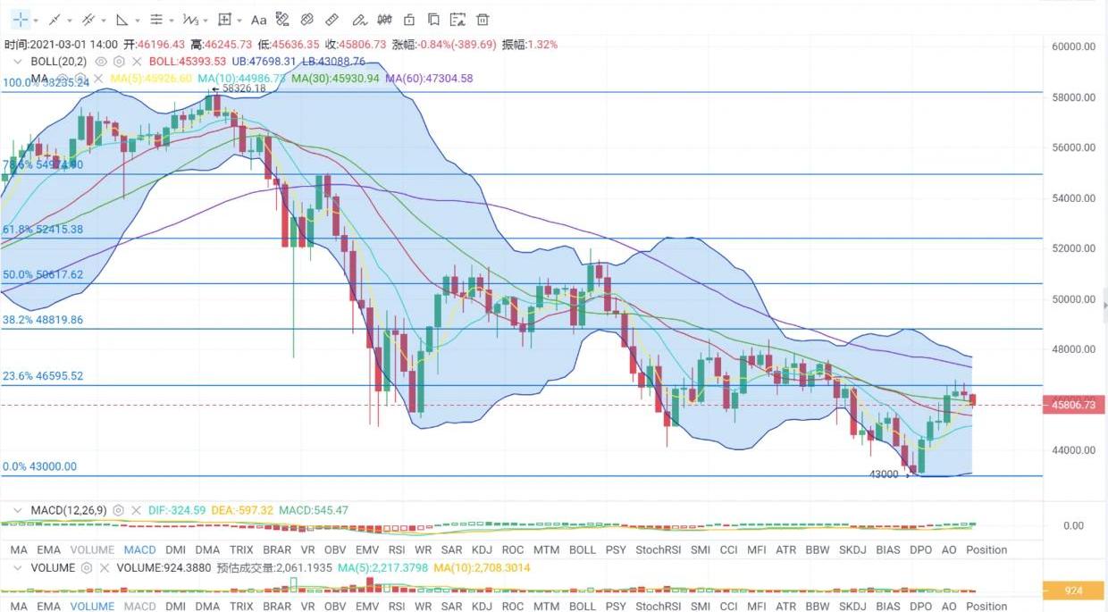 那么目前最低點在43000,當前在46300附近運行,那么這么的反彈力對是要強一些的,但并沒有收復之前的點位,最終還是在斐波那契23.6%位置46600附近承壓回落。