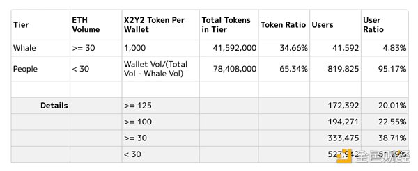 空投方面,根據 Litepaper,X2Y2 將向超 86 萬名 OpenSea 用戶發放空投(已在區塊高度 13916166 處完成快照),為了降低巨鯨效應,X2Y2 會為在 OpenSea 上交易量大于等于 30 ETH 的巨鯨用戶均發放 1000 枚 X2Y2,為交易量小于 30 ETH 的用戶按照其交易量占比分配空投。
