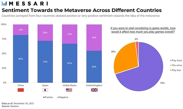 上方柱狀圖表示了不同國家對于元宇宙的情緒占比情況 (藍色表示積極情緒,紫色表示消極情緒)
