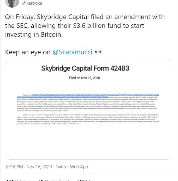 除了灰度外,其他傳統金融機構也有了動靜,加密研究員KevinRooke在推特分享的圖片顯示,美國知名對沖基金公司天橋資本在11月13日向SEC提交了一份修正案,尋求允許其36億美元的基金開始投資比特幣。
