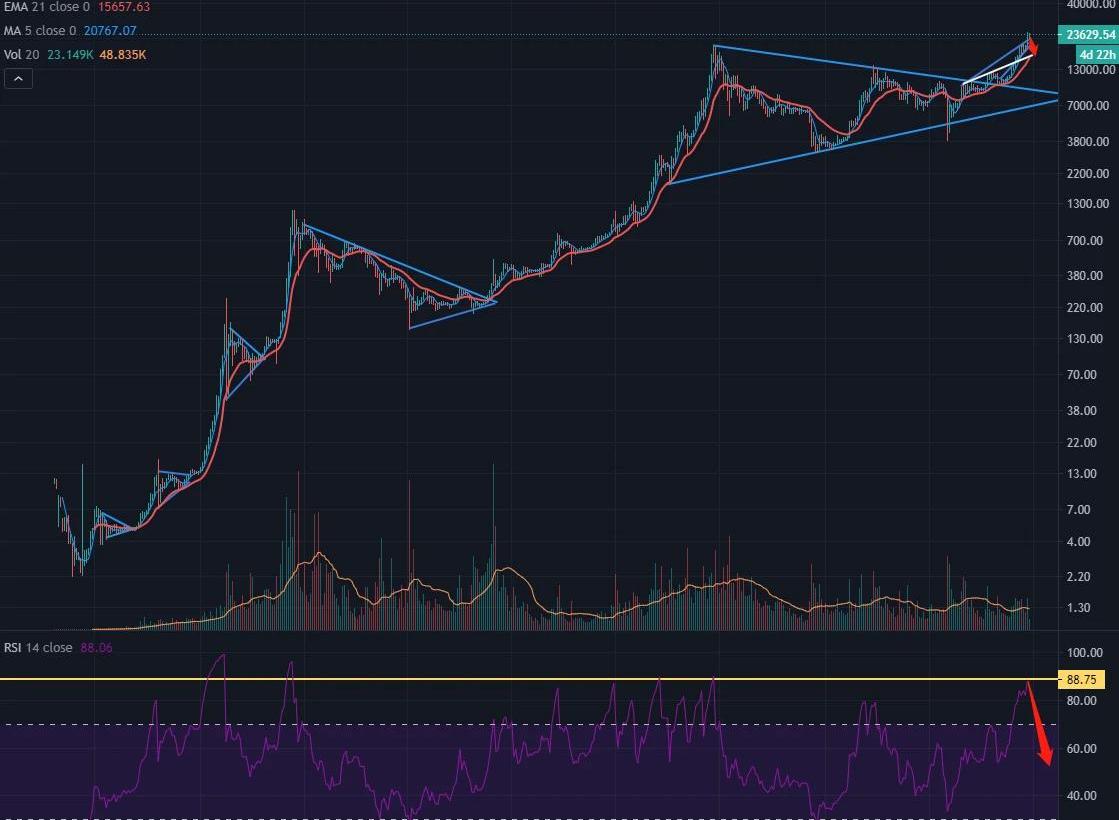 我們注意到比特幣周線RSI已經達到88,縱觀比特幣歷史,每當比特幣的周線超買情況到達該等級,比特幣均進行了較大幅度的快速回調。