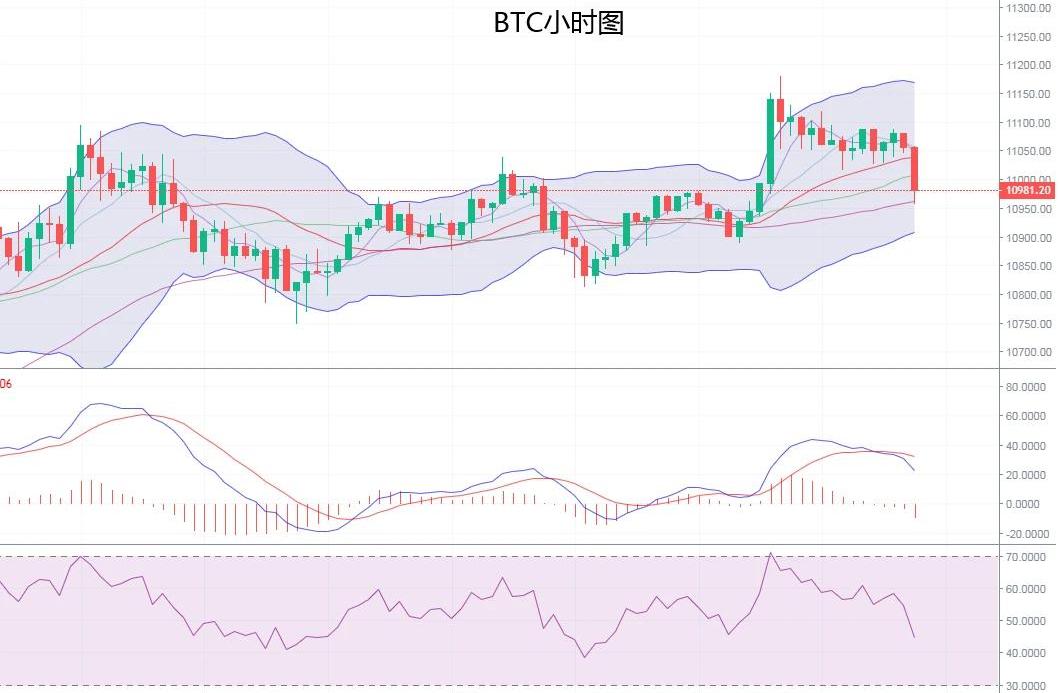 前面的分析中我們就說過,上方的重要壓制在日線MA60均線附近,昨日雖然破位一下,但是迅速的回落到這個均線下方,屬于虛破,那么短期我們的重要壓制位依然可以先看這個均線附近。技術面來看,目前小時圖MACD死叉,RSI超買回落,從指標上看短期來看應該是有回落的行情,不過小時圖的布林帶明顯是朝上的,這是一個上漲的信號,而且日線MA5均線是拐頭向上,并且依然是近期的支撐位,所以個人認為今日還是先以震蕩對待,應該還是先跌后漲的走勢。那么短期上方關注昨日高點11180和日線MA60均線11130附近的壓制位,防守壓制11350-11400和日線上軌11600附近,下方支撐關注小時圖MA60均線也是日線MA30均線10950和日線MA5均線10980附近的支撐位,防守支撐關注小時圖布林下軌10900和日線MA10均線10730附近。短期操作上個人建議先以10900-11180這個區間對待,破位再順勢操作即可。