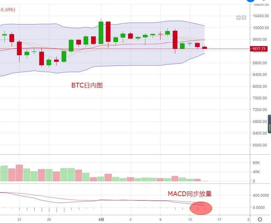 昨日BTC日收陰線十字星線,日間行情再次收縮至短線區間震蕩運行,白盤振幅幅度一度維持在60個點,臨近晚盤才開始真正意義上的波動。日線上,MA5、10均線繼續下行,分別與MA30均線和中軌形成壓力區間在9450-9550附近,壓力位下移的同時高點位置也在下移,且下方同步放量,空頭占優。