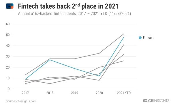 圖 | 2017 年至 2021 年 a16z 在金融科技領域的投資數量變化(來源:CB Insights)